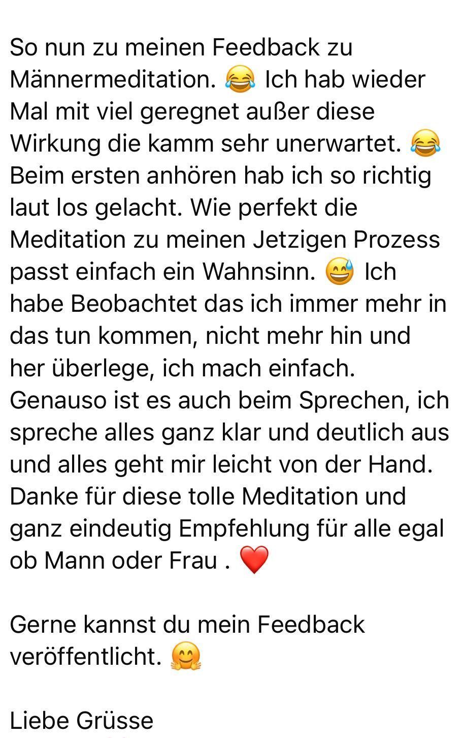 ich bin schon voll dabei und höre diese Meditation Nacht für Nacht. Die ersten zwei, drei Tage ging es mir nicht ganz so gut, aber das hat sich mittlerweile gelegt. Diese Männer Meditation macht tatsächlich etwas mit mir und sie ist wunderbar.